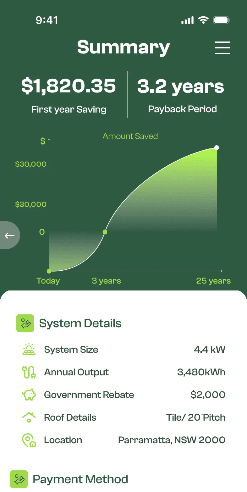 As part of a design challenge for a venture-backed fintech initiative, I was tasked with creating native iOS app screens for a solar system calculator and quote summary. The goal was to help customers understand the financial impact of installing a solar system — from upfront costs to long-term savings — and guide them confidently through their decision-making process.