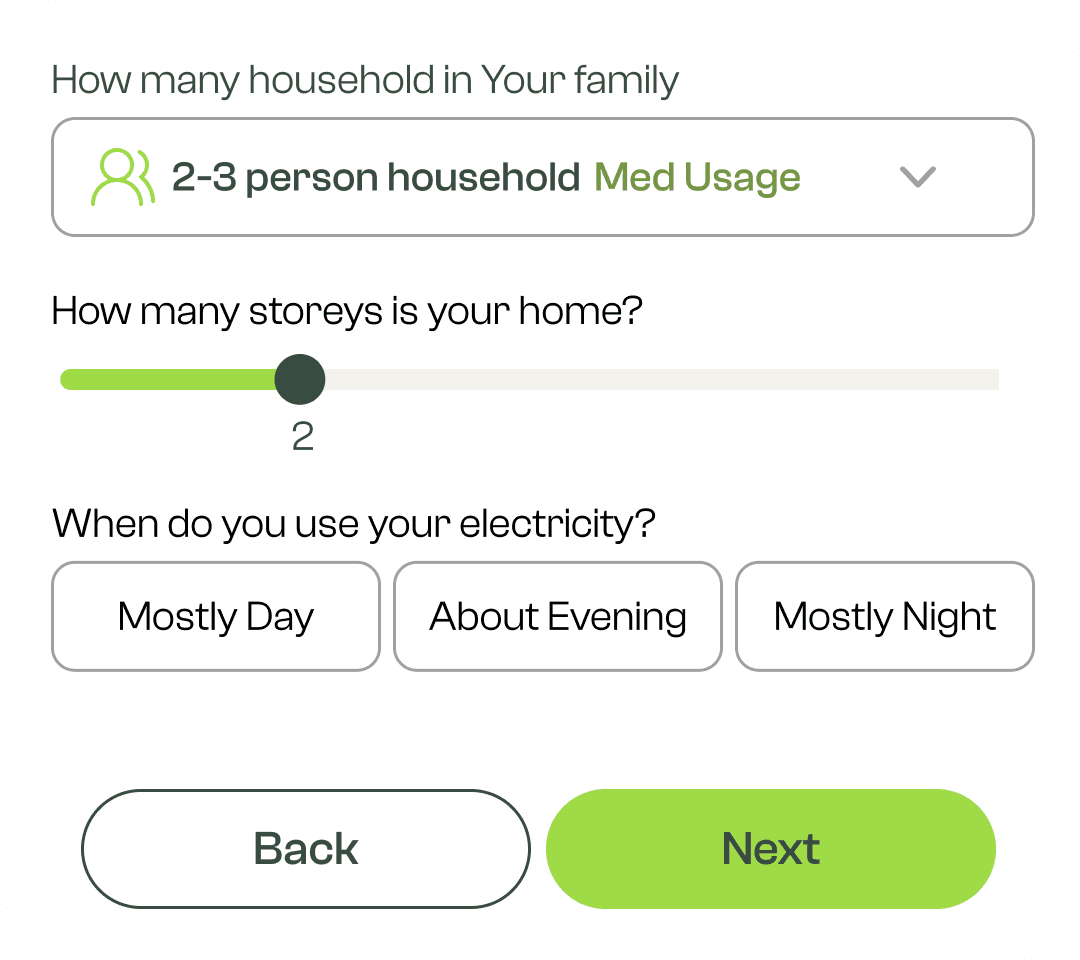 Claire might not know her kilowatt usage, so I offered an alternative estimation path based on household size and time-of-use habits.