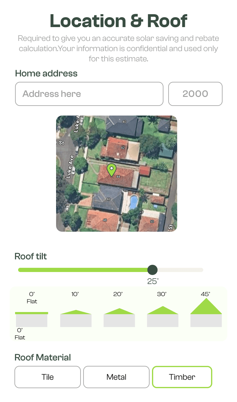 📍 Postcode input follows—used to infer sunlight intensity, average system sizes, and region-specific defaults for smarter recommendations.