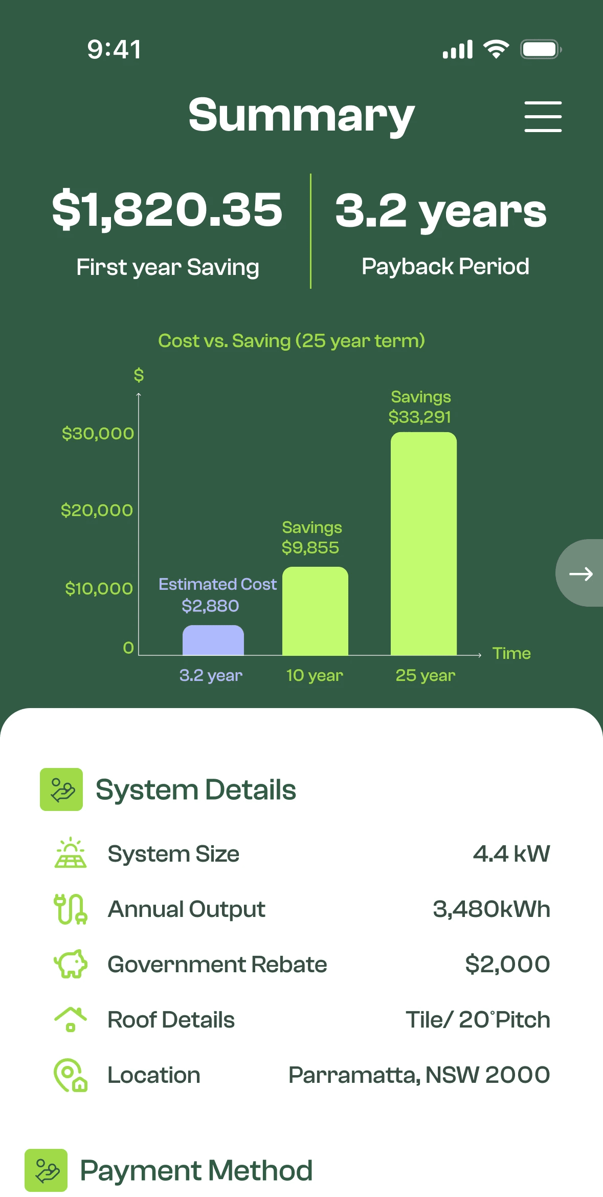Key insights like first-year savings, payback time, and monthly repayment are visually prioritised